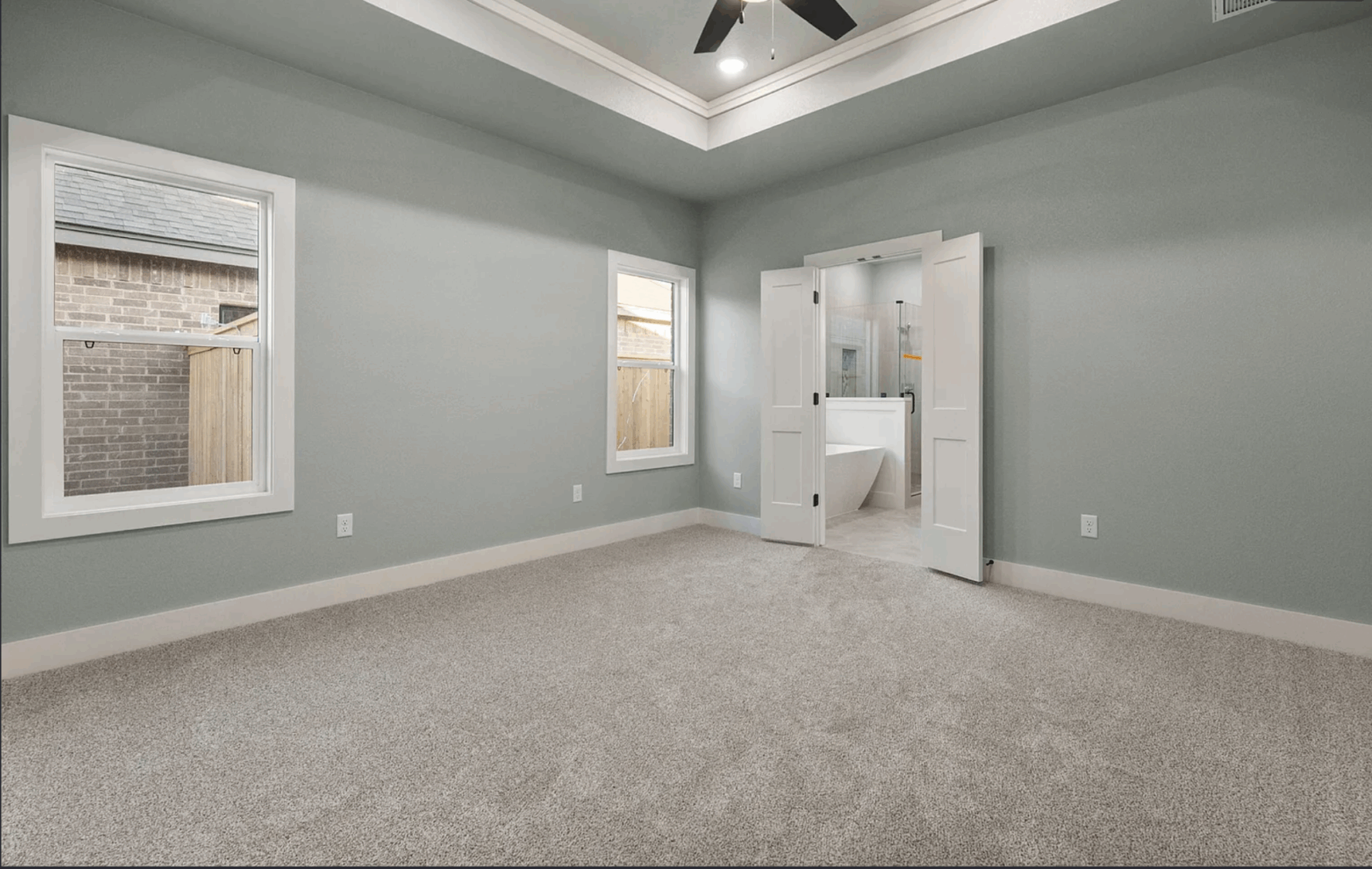 The private primary suite is tucked away for relaxation, complete with a luxurious ensuite that includes dual vanities, a soaking tub, walk-in shower, and a spacious walk-in closet. Three secondary bedrooms are located near the front and right side of the home and share a well-appointed full bathroom.