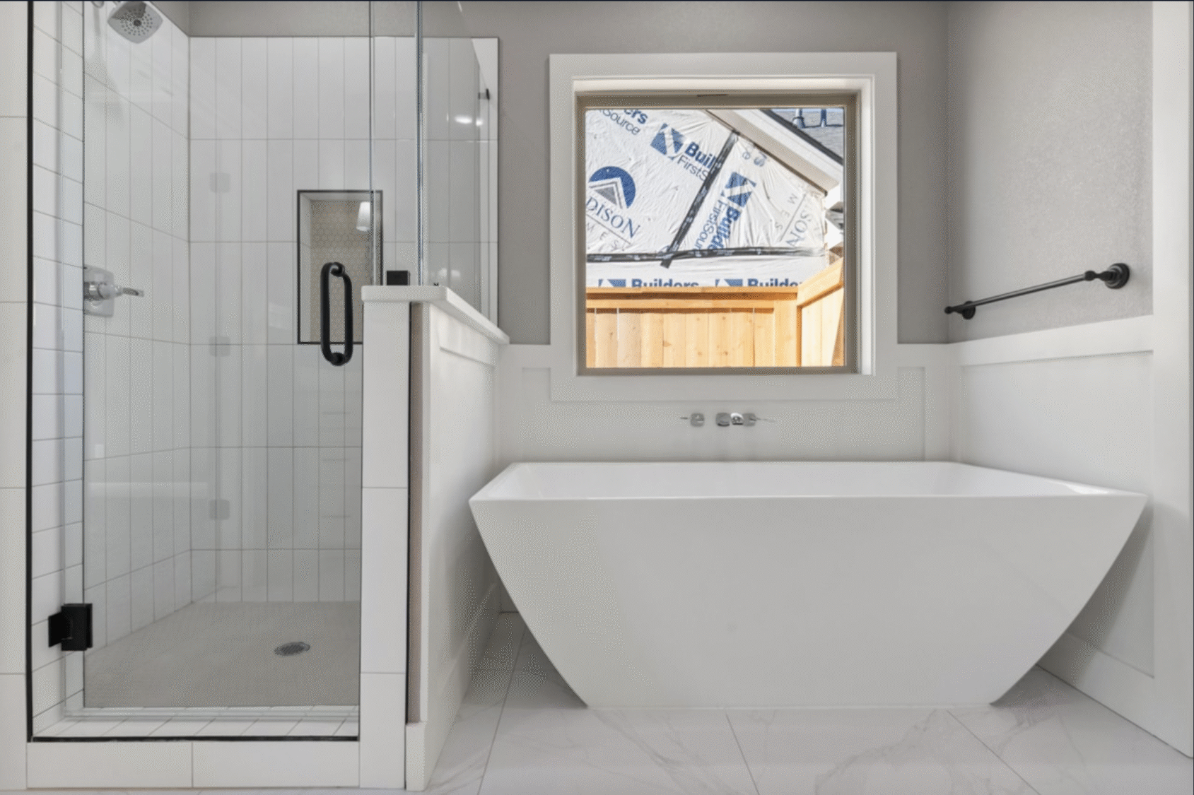 The private primary suite is tucked away for relaxation, complete with a luxurious ensuite that includes dual vanities, a soaking tub, walk-in shower, and a spacious walk-in closet. Three secondary bedrooms are located near the front and right side of the home and share a well-appointed full bathroom.